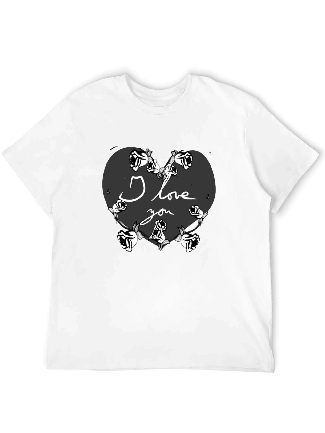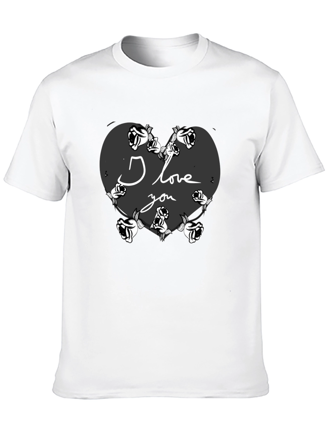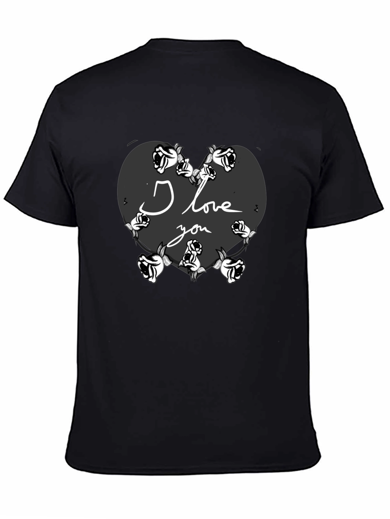 Show your love with this unique black t-shirt featuring a heart design surrounded by roses. The words 'I Love You' are elegantly inscribed within the heart, making it a perfect gift for Valentine's Day or any special occasion. This comfortable t-shirt is made from soft fabric, ensuring all-day comfort. The bold design stands out, expressing your affection with style. Whether you're going on a date or simply want to express your feelings, this t-shirt is a fashionable and meaningful choice. Order yours today and wear your heart on your sleeve!