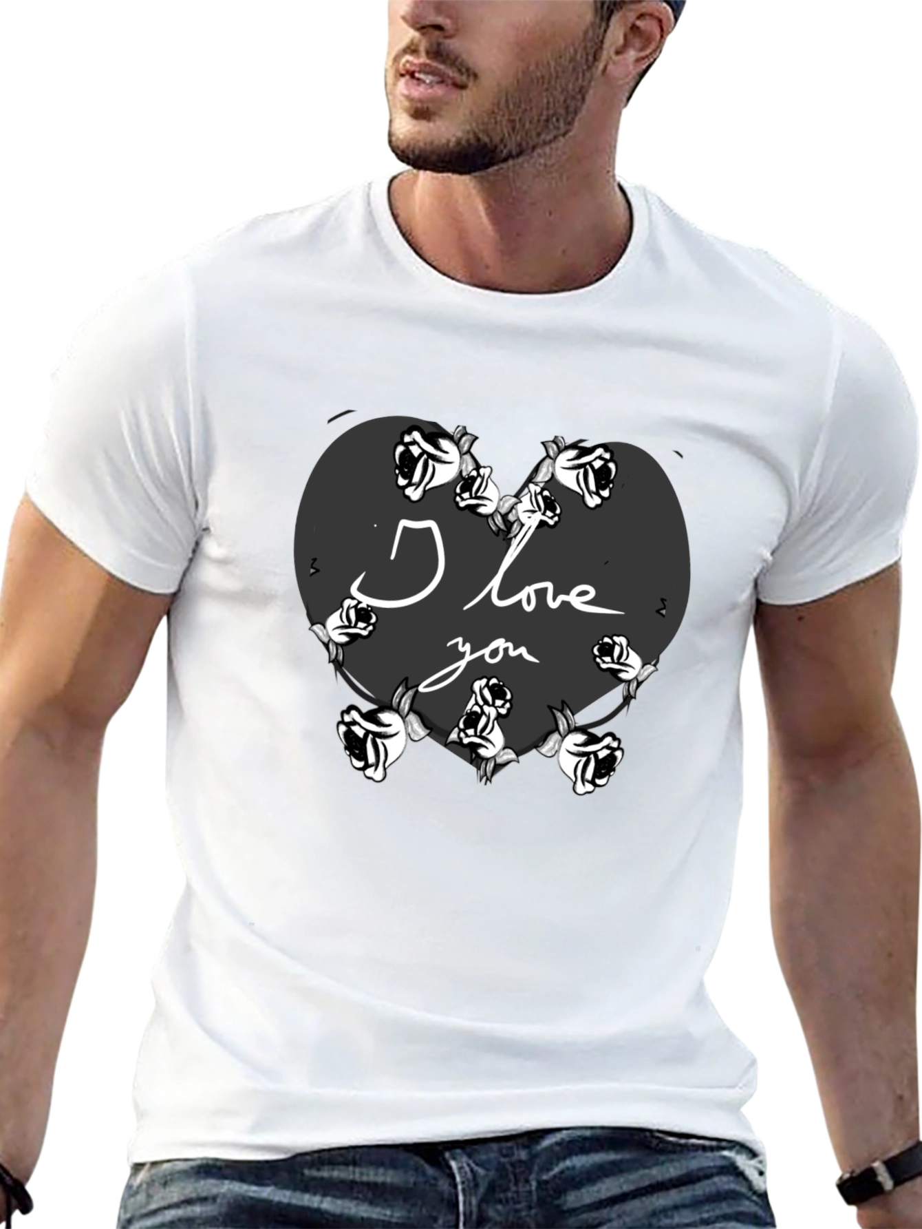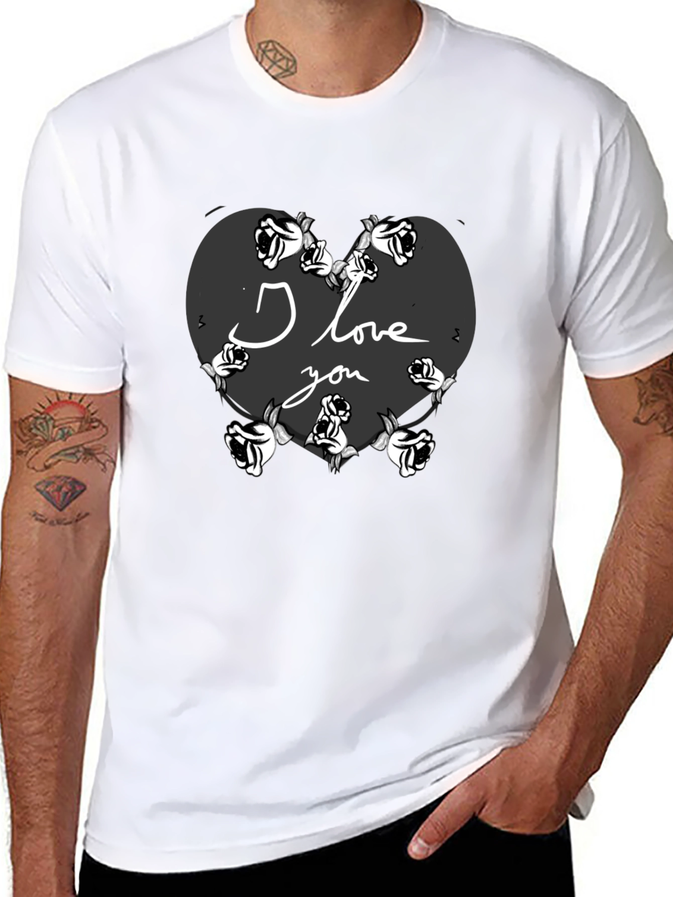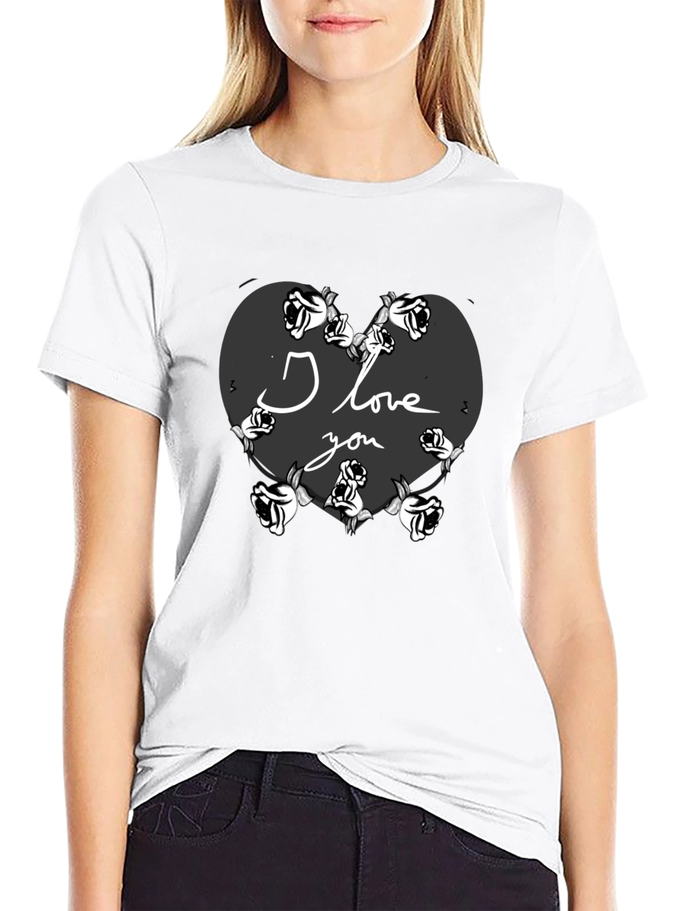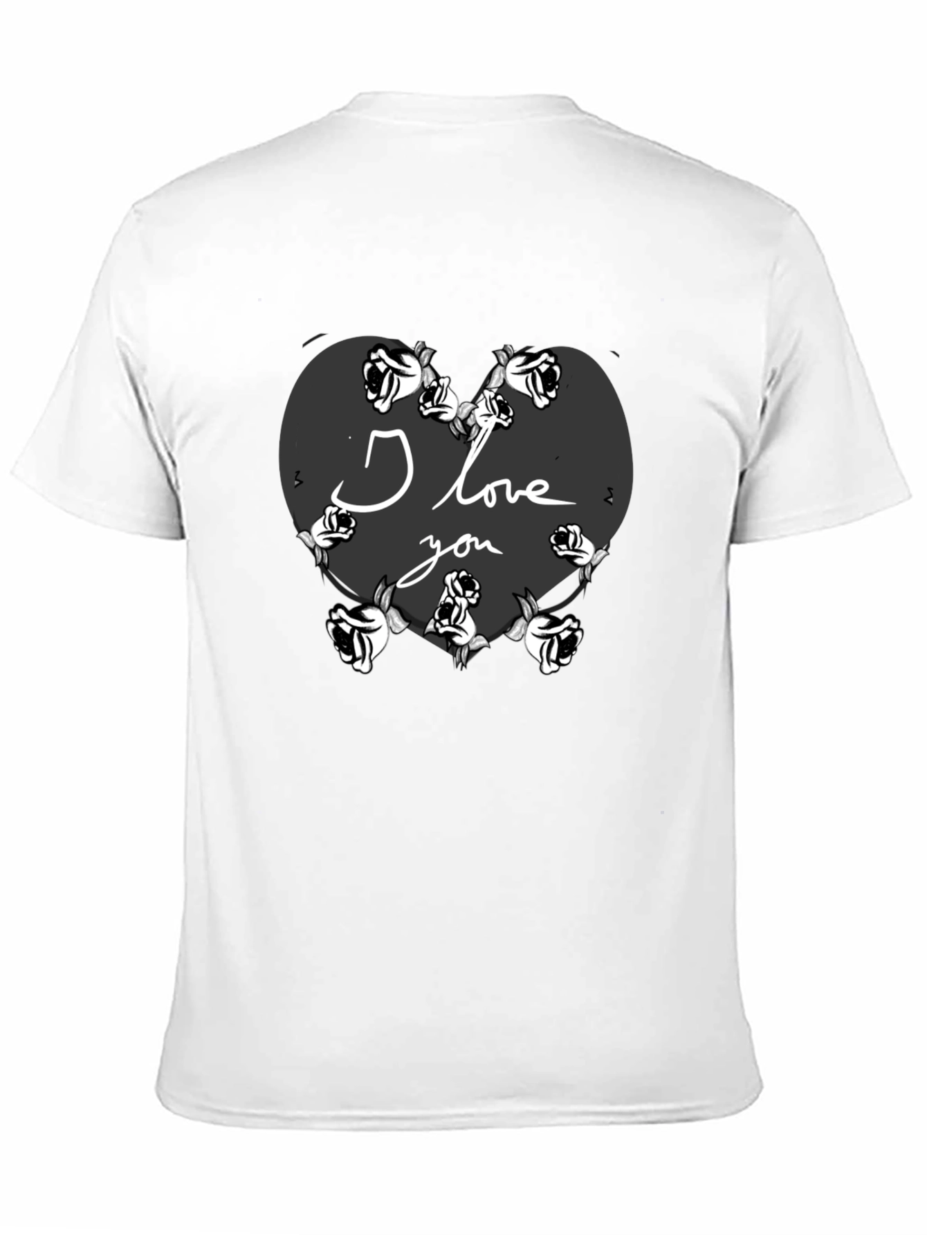 Show your love with this unique black t-shirt featuring a heart design surrounded by roses. The words 'I Love You' are elegantly inscribed within the heart, making it a perfect gift for Valentine's Day or any special occasion. This comfortable t-shirt is made from soft fabric, ensuring all-day comfort. The bold design stands out, expressing your affection with style. Whether you're going on a date or simply want to express your feelings, this t-shirt is a fashionable and meaningful choice. Order yours today and wear your heart on your sleeve!