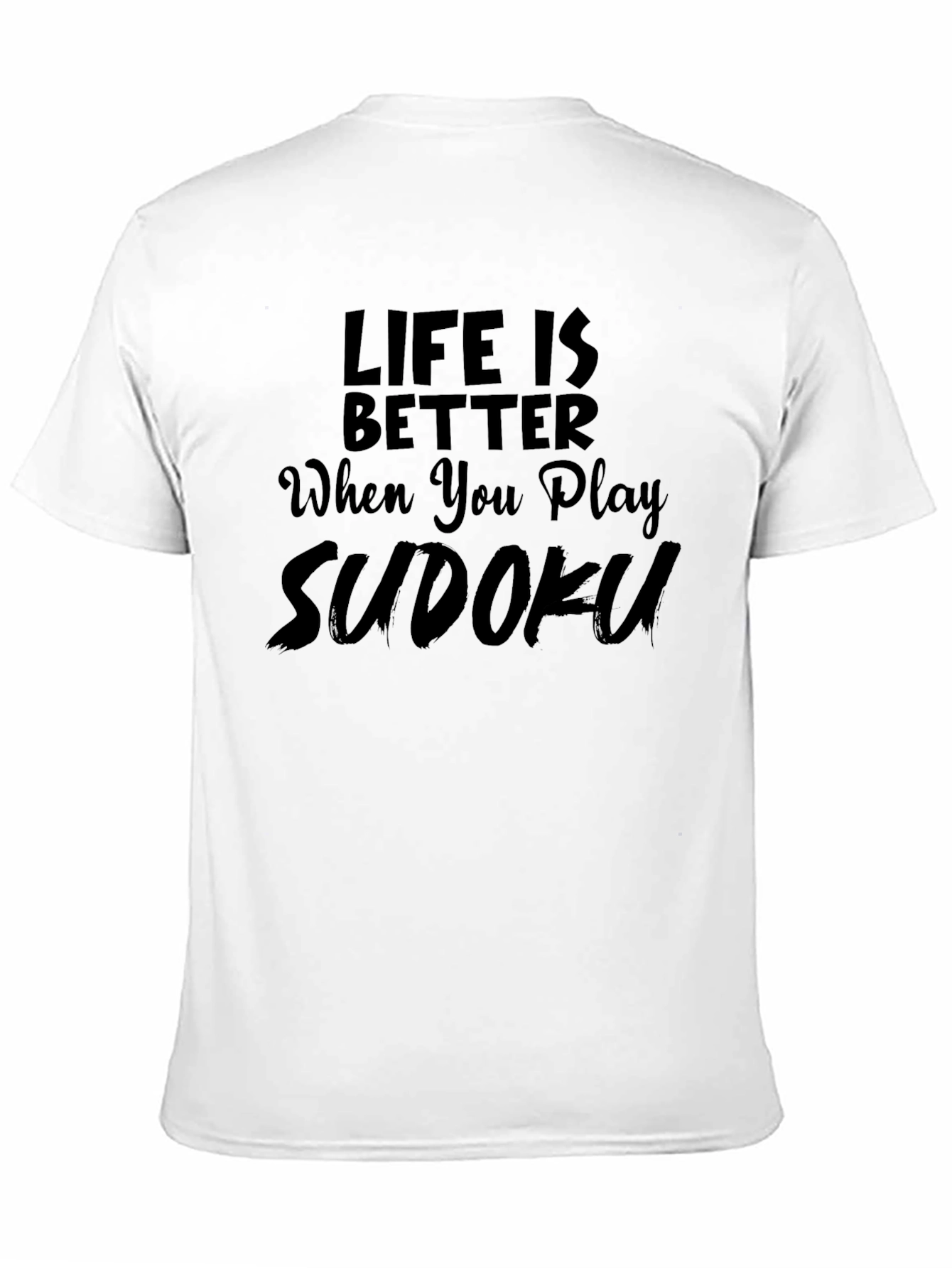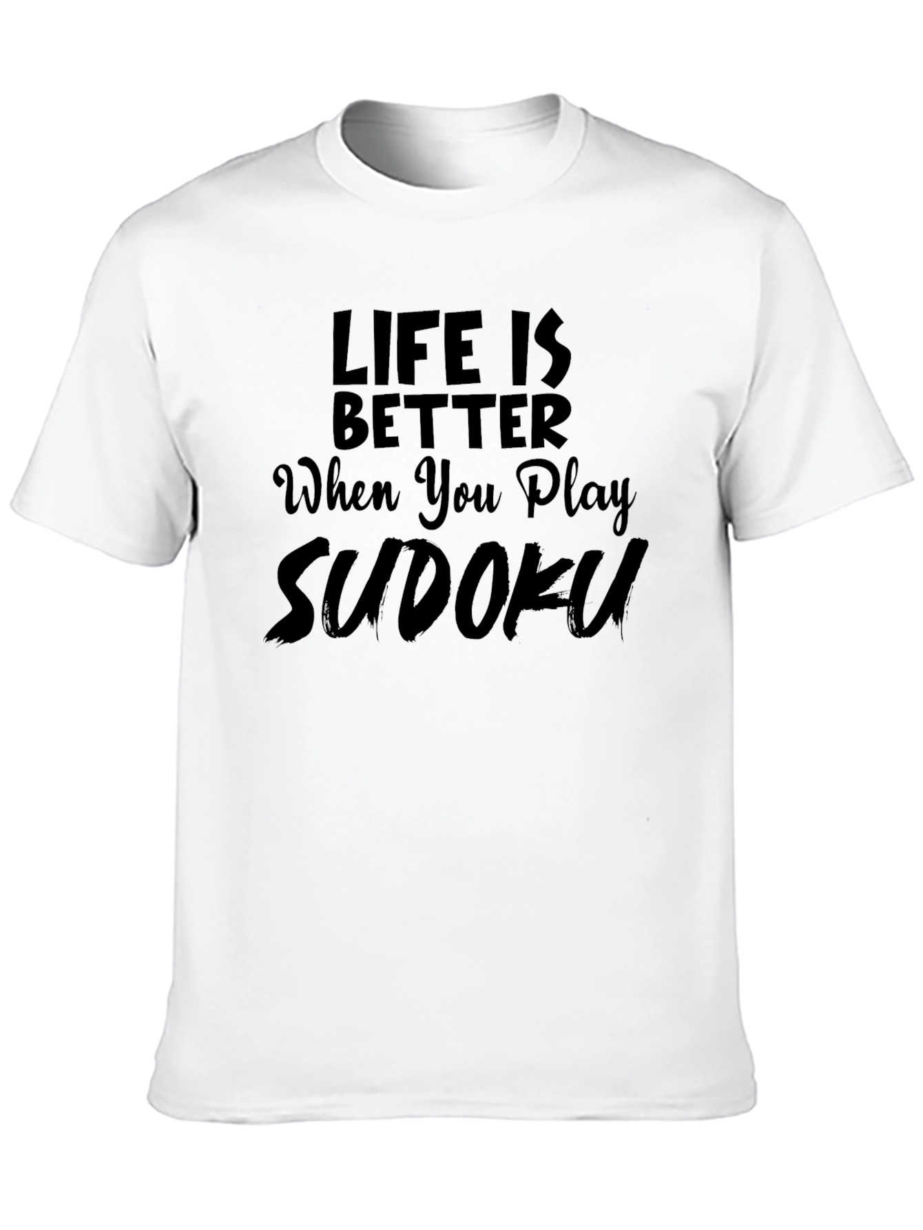 Show your love for puzzles with this black 'Life is Better When You Play Sudoku' T-shirt. The classic fit and soft fabric provide all-day comfort, while the bold text makes a statement. Ideal for casual wear, Sudoku game nights, or as a gift for puzzle enthusiasts. Wear this tee to express your passion for Sudoku and start conversations wherever you go. It's a fun and stylish way to showcase your interests. This shirt is perfect for relaxing at home with a Sudoku book or meeting up with friends. Enjoy the comfort and style of this unique design.