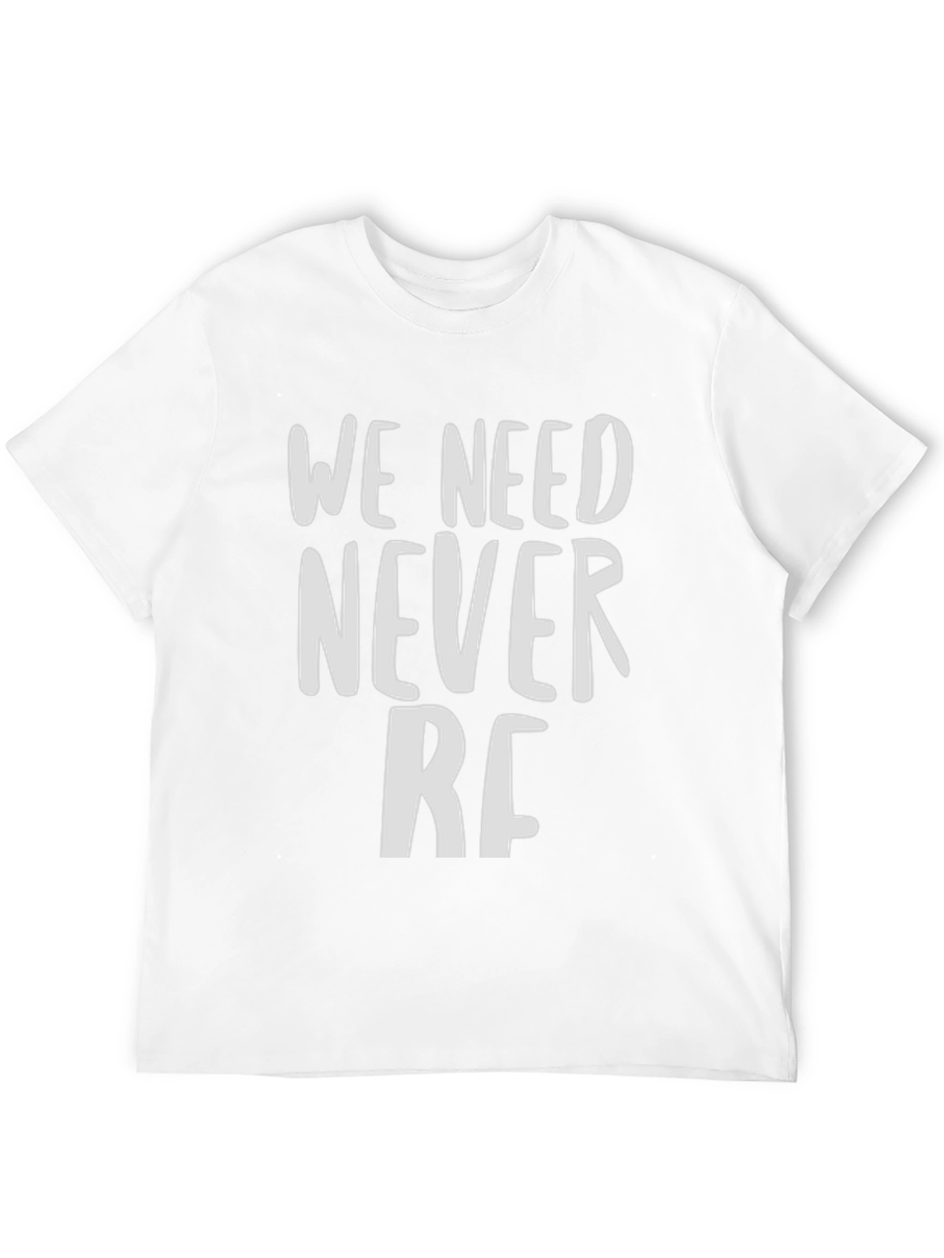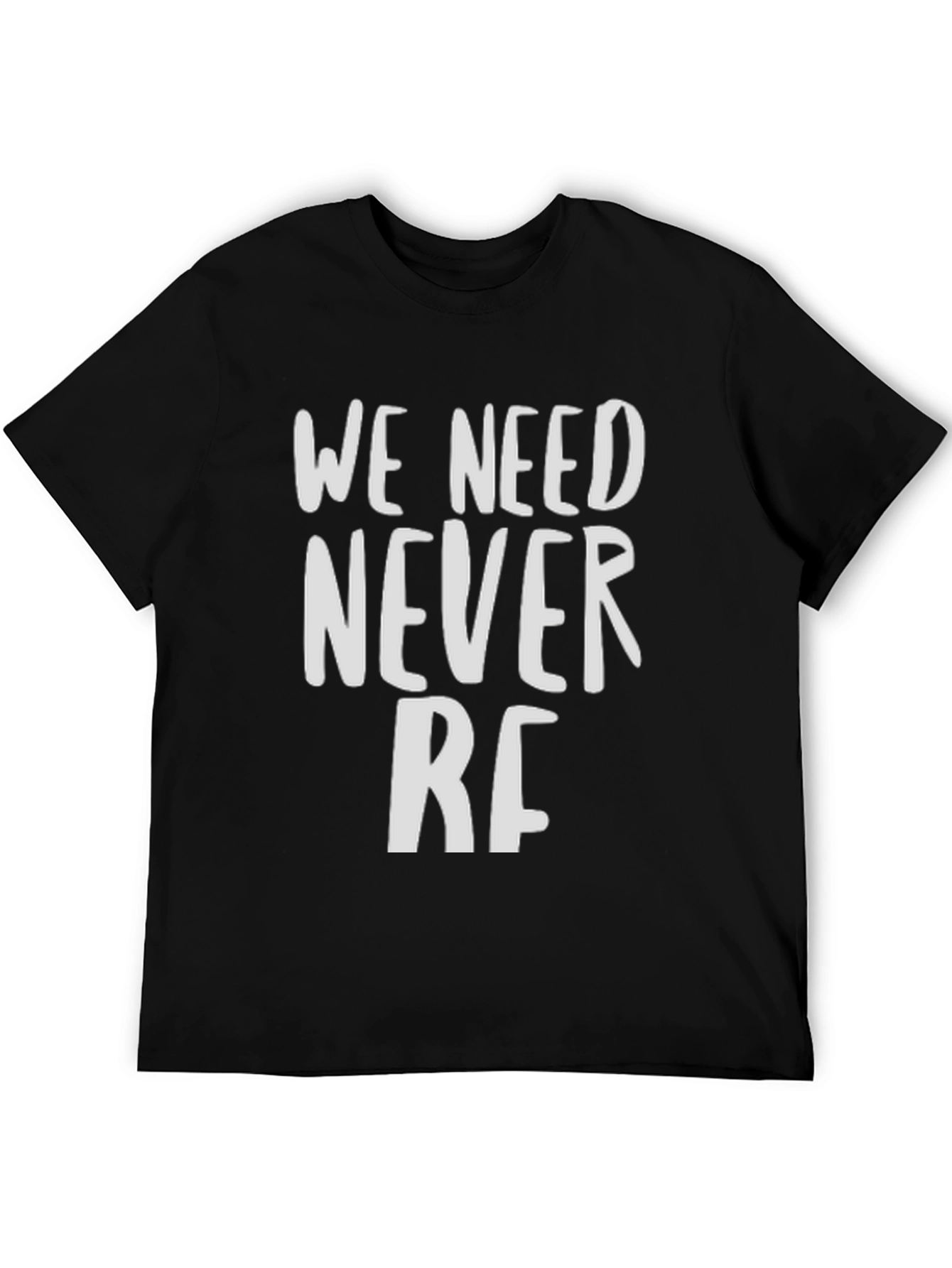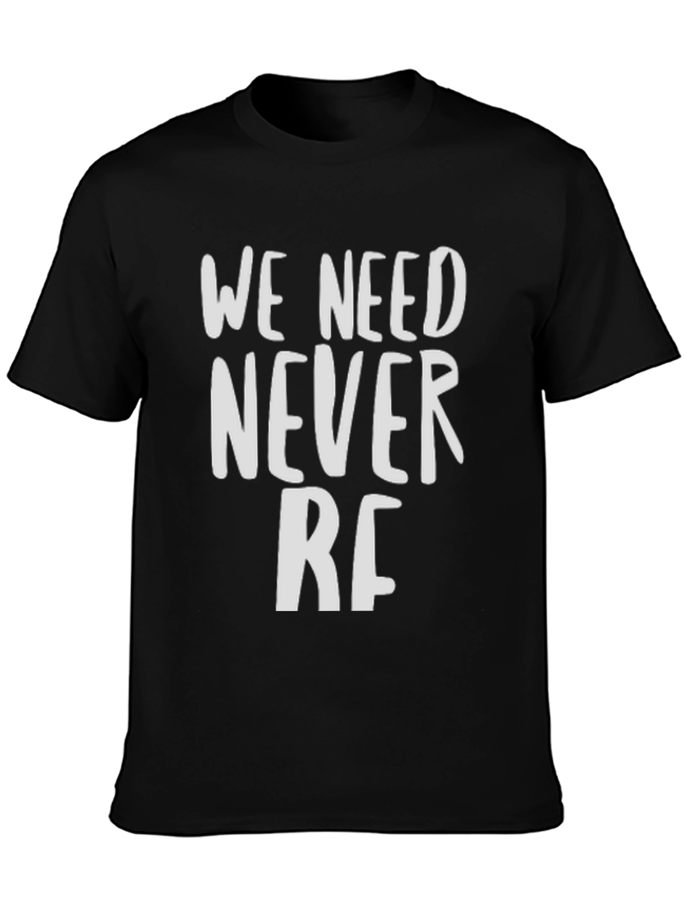 Make a statement with this eye-catching black t-shirt featuring the text "WE NEED NEVER RF" in a bold, white font. The classic crew neck and short sleeves offer a comfortable and versatile fit, perfect for everyday wear. The graphic print adds a touch of humor and personality to your wardrobe. Made from a soft-looking cotton blend, this tee is designed for comfort and durability. Pair it with jeans, shorts, or joggers for a casual and stylish look. Express yourself with this unique and trendy t-shirt, ideal for those who love to make a statement.