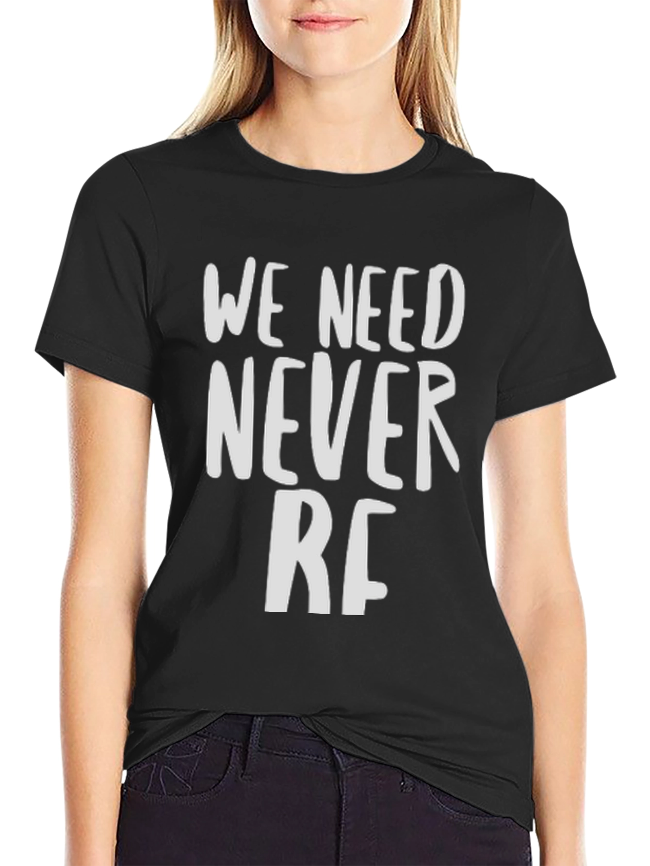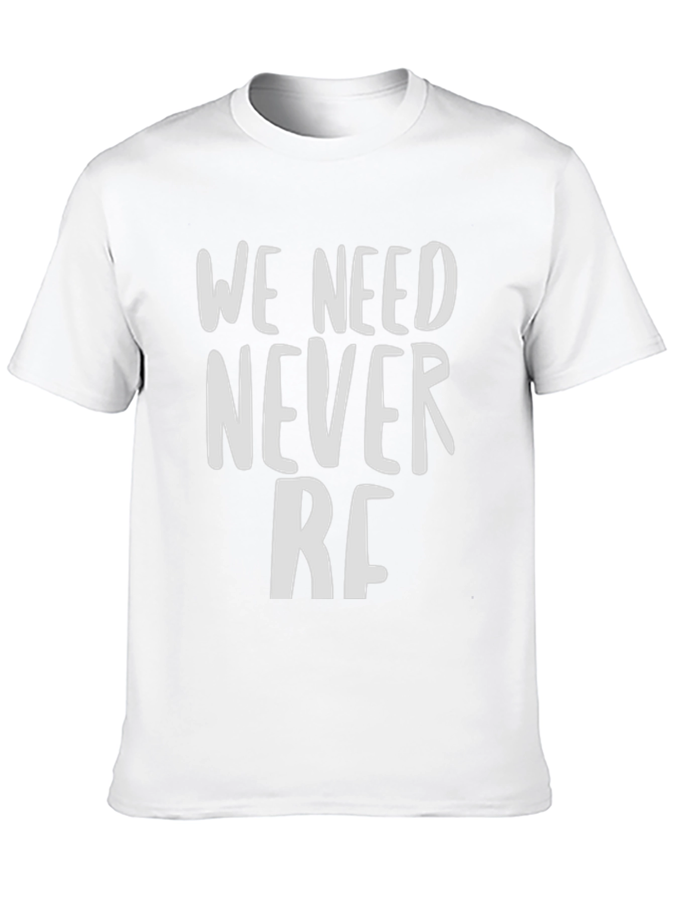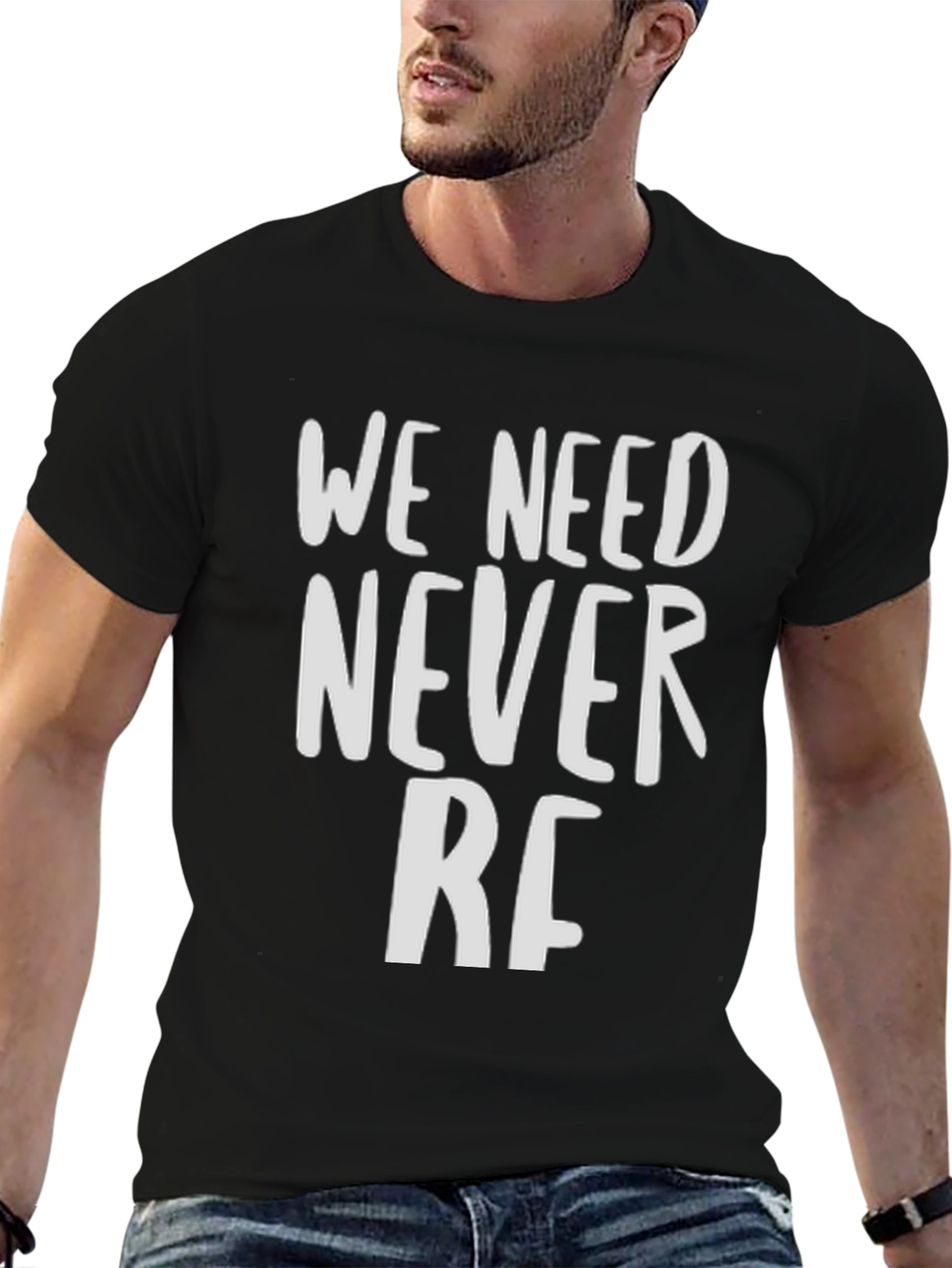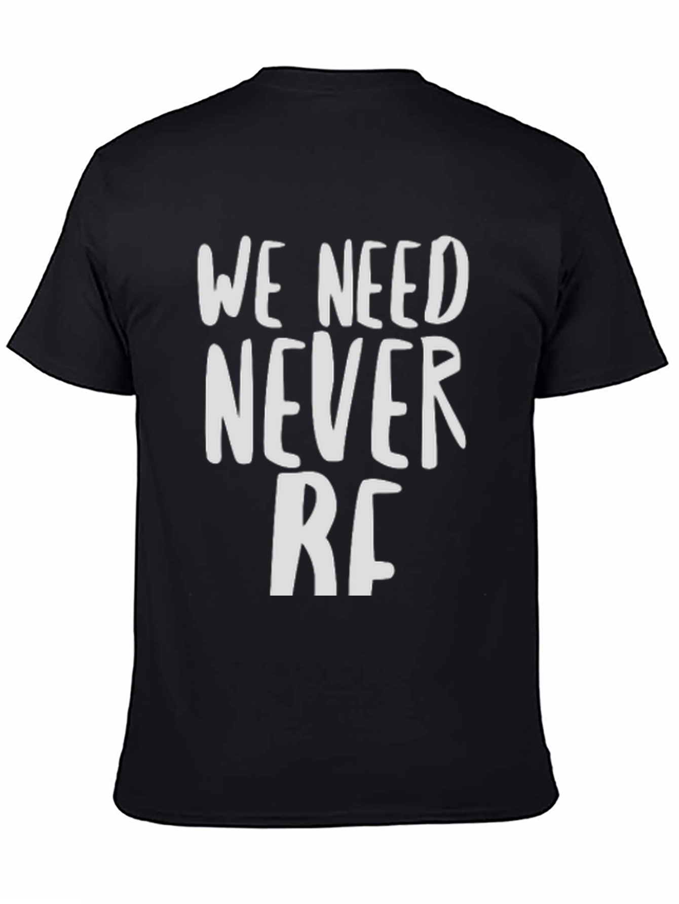 Make a statement with this eye-catching black t-shirt featuring the text "WE NEED NEVER RF" in a bold, white font. The classic crew neck and short sleeves offer a comfortable and versatile fit, perfect for everyday wear. The graphic print adds a touch of humor and personality to your wardrobe. Made from a soft-looking cotton blend, this tee is designed for comfort and durability. Pair it with jeans, shorts, or joggers for a casual and stylish look. Express yourself with this unique and trendy t-shirt, ideal for those who love to make a statement.